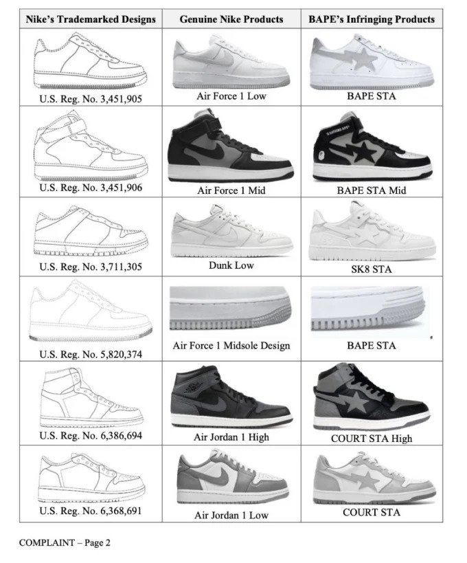 Nike, pozivajući se na patike BAPE koje su prodavci na drugom tržištu nazivali Air Force 1s ili Dunks, zatražio je od suda da naredi BAPE-u da prestane da prodaje patike. Pored toga, traži neodređeni iznos novca za odštetu.